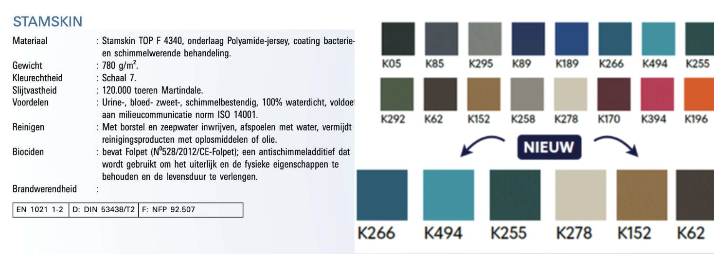 Beide typen bekledingen zijn 100% waterdicht en urine, bloed, zweet en schimmelbestendig. Beide stofferingen zijn ook goed te reinigen met een borstel en zeep.